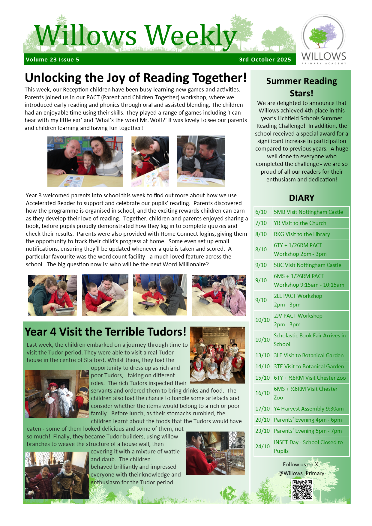Willows Weekly Willows Weekly PDF Downloads 2025 Willows Weekly - Autumn Term Week 5 - 3rd October Click to download. Week 4 - 26th September Click to download. Week 3 - 19th September Click to download. Week 2 - 12th September 2025 Click to download. Week 1 - 5th September 2025 Click to download. 2025 Willows Weekly - Summer Term Week 11 - 18th July 2025 Click to download. Week 10 - 11th July 2025 Click to download. Week 9 - 4th July 2025 Click to download. Week 8 - 27th June 2025 Click to download. Week 7 - 19th June 2025 Click to download. Week 6 - 13th June 2025 Click to download. Week 5 - 6th June 2025 Click to download. Week 4 - 23rd May 2025 Click to download. Week 3 - 16th May 2025 Click to download. Week 2 - 9th May 2025 Click to download. Week 1 - 2nd May 2025 Click to download. 2025 Willows Weekly - Spring Term Week 14 - 11th April 2025 Click to download. Week 13 - 4th April 2025 Click to download. Week 12 - 28th March 2025 Click to download. Week 11 - 21st March 2025 Click to download. Week 10 - 14th March 2025 Click to download. Week 9 - 7th March 2025 Click to download. Week 8 - 28th February 2025 Click to download. Week 7 - 14th February 2025 Click to download. Week 6 - 7th February 2025 Click to download. Week 5 - 31st January 2025 Click to download. Week 4 - 24th January 2025 Click to download. Week 3 - 17th January 2025 Click to download. Week 2 - 10th January 2025 Click to download.